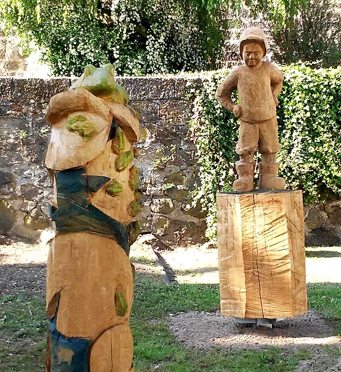 Die Skulpturen stellen die Figuren einer Dorflegende dar, nach welcher der Pfarrer während der Predigt von den Fröschen im Teich neben der Kirche gestört wurde und einen Jungen hinaus schickte, um die Frösche zur Ruhe zu bringen. Der Waberner Heimatdichter Albert Rotter hat diese Legende in einem Gedicht festgehalten.